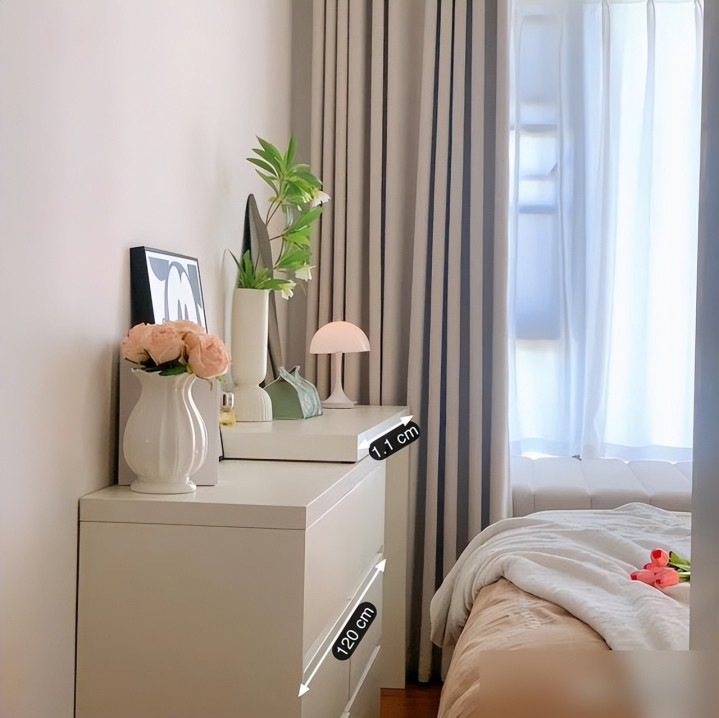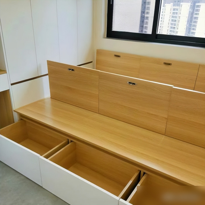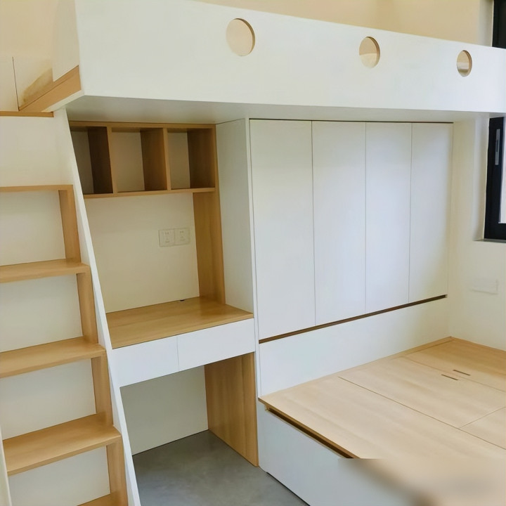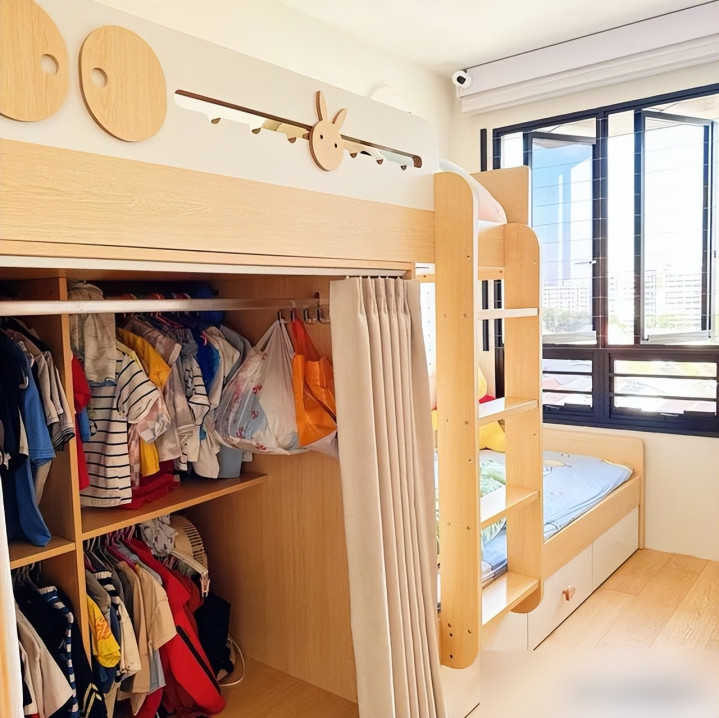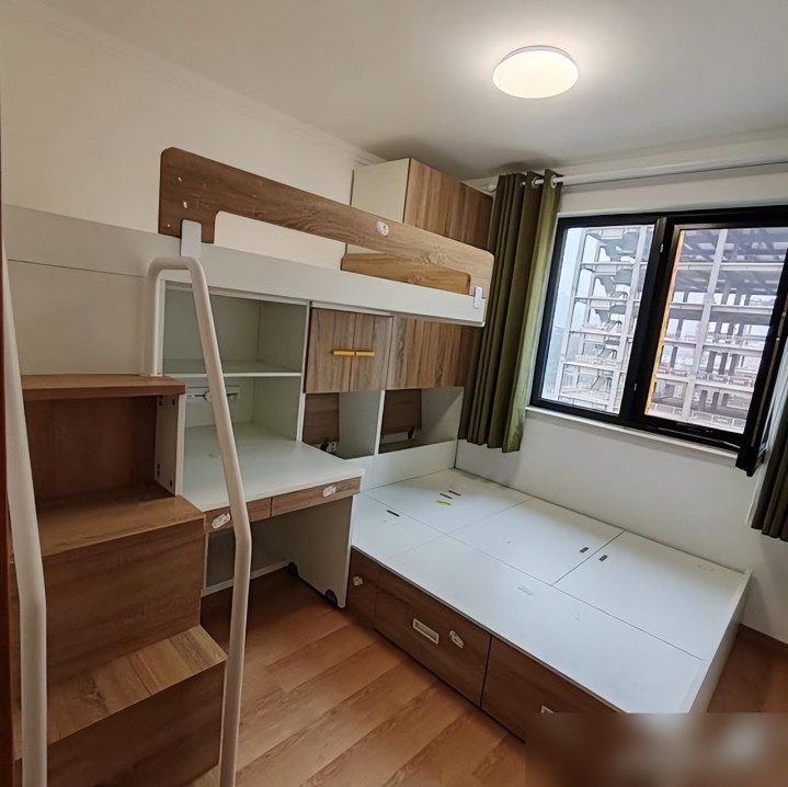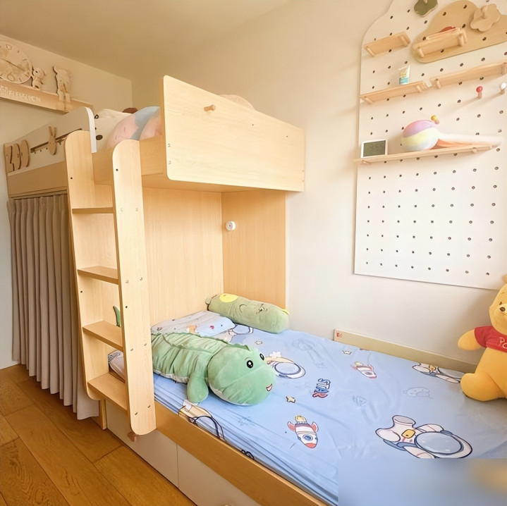闺蜜家俩娃的房间,居然放了张“错位上下铺”——下铺1.5米给老二,上铺1.2米给老大,俩床错开半张的位置,中间的踏步楼梯做了抽屉,能装俩娃的绘本、玩具车,甚至连老大的漫画书都塞得下。